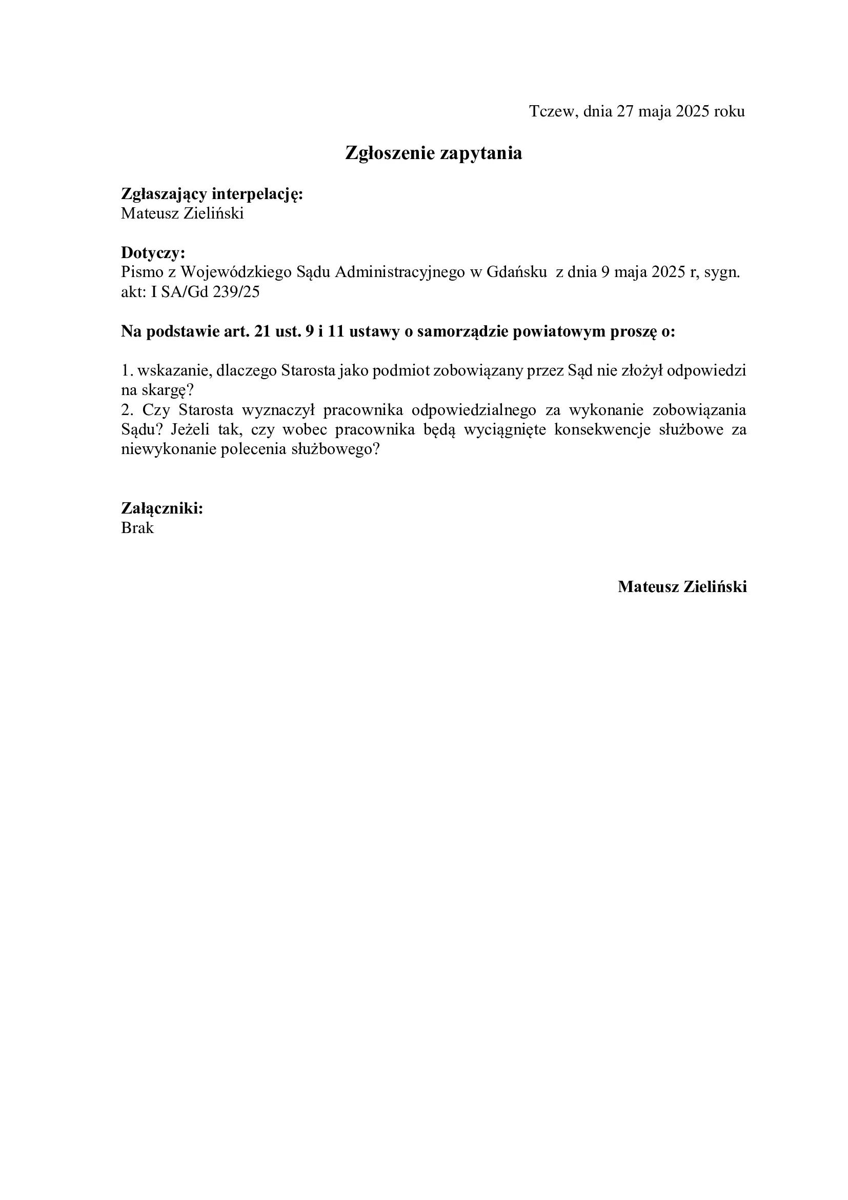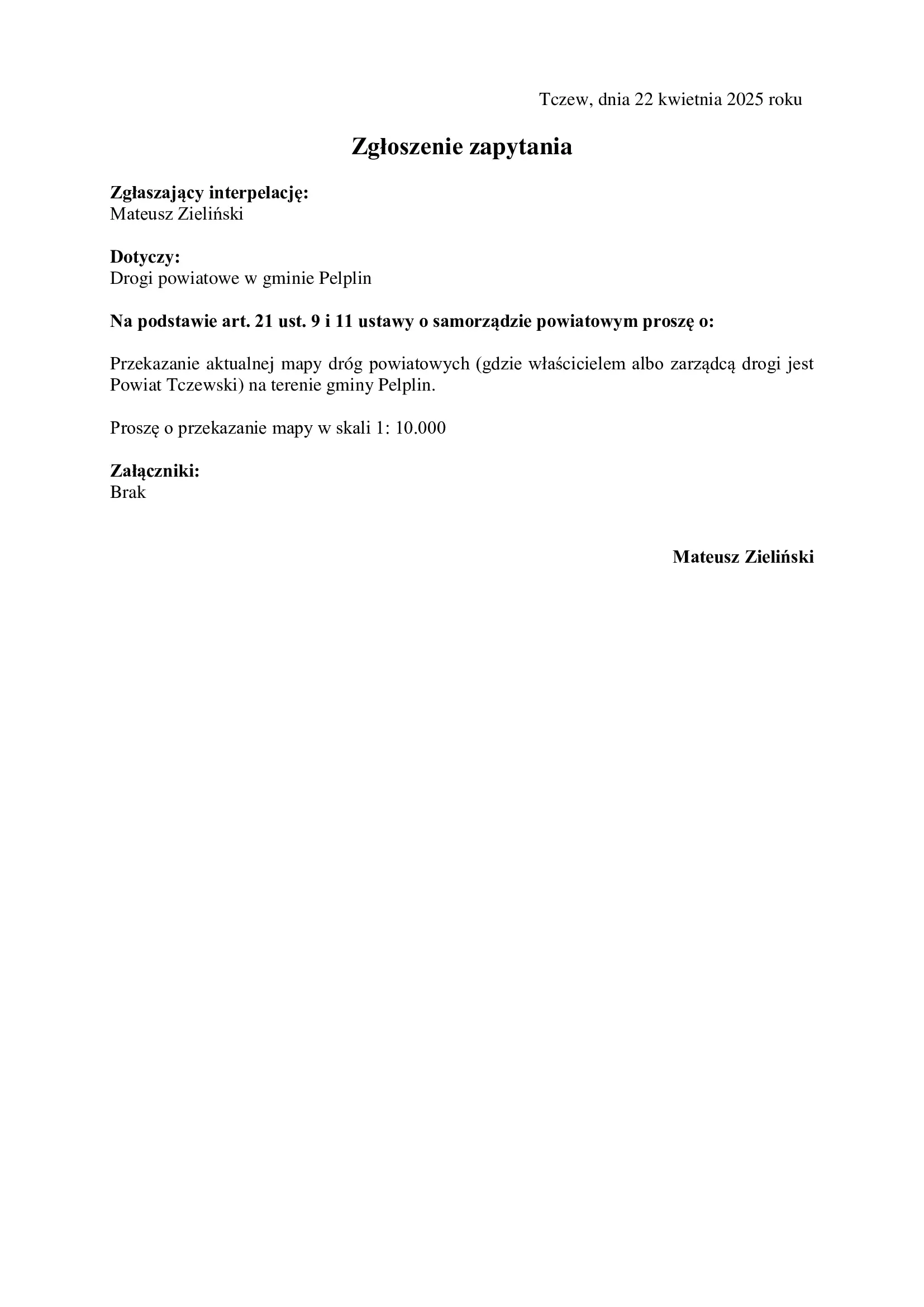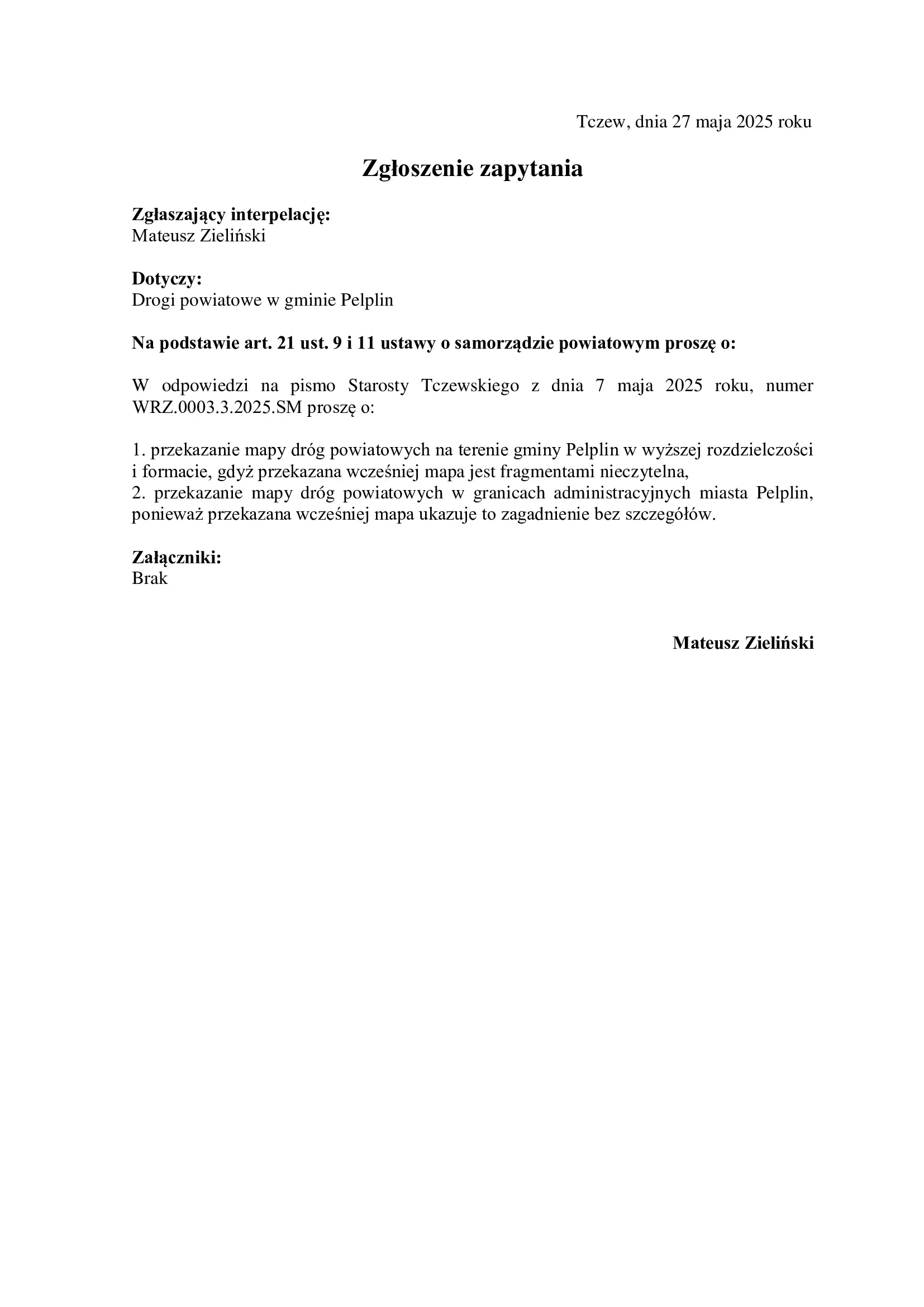 Nazywam się Mateusz Zieliński – radny Powiatu Tczewskiego wybrany w wyborach samorządowych 2024 roku (okręg nr 4, Lista nr 1, KW Prawo i Sprawiedliwość), zdobywając 457 głosów, co stanowiło ok. 9,15% w okręgu