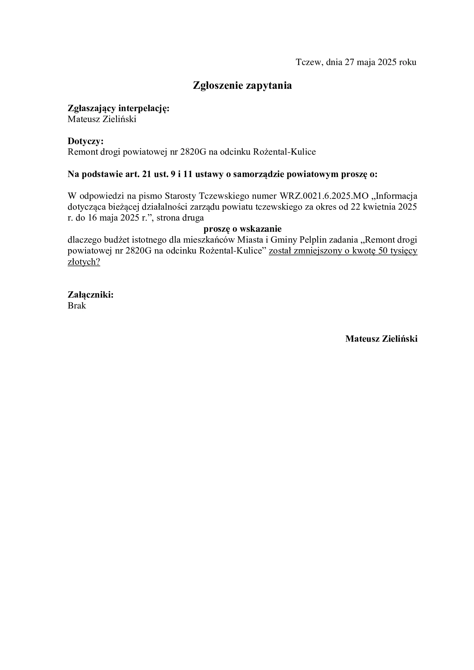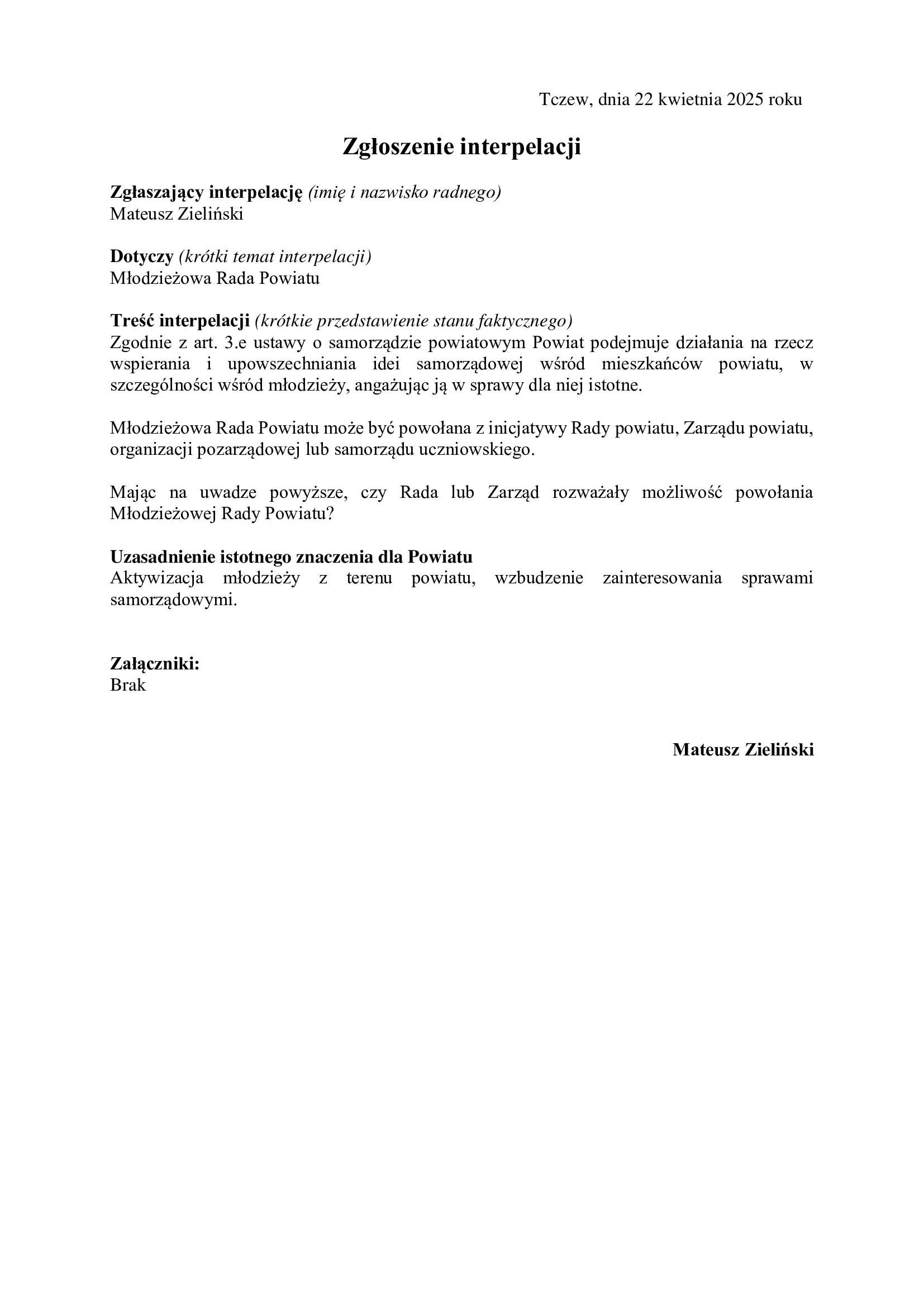 - wsparcie młodych obywateli przez inicjowanie Młodzieżowej Rady Powiatu – interpelację w tej sprawie złożyłem w kwietniu 2025 roku